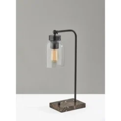 Brighten your desk, table, or nightstand with the mid-century modern styling of the 19″ tall Bristol desk lamp. The 5″ x 7″ rectangular brown marble base is both stylish and sturdy, while the slender stem and socket feature a black metal finish. To spotlight the included decorative 40W vintage Edison bulb, the dome-shaped shade is crafted of clear glass. This lamp also features an articulation point at the base of the shade, allowing you to direct the light wherever it’s needed. Operated by a rotary switch in black metal finish located on the base, the lamp also includes a 5′ black cord. The Bristol desk lamp is also available with an antique brass finish.
