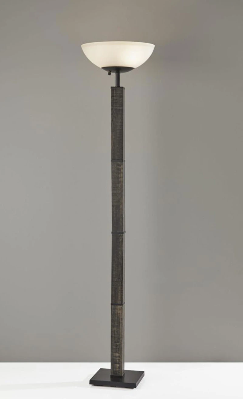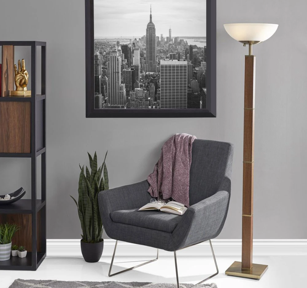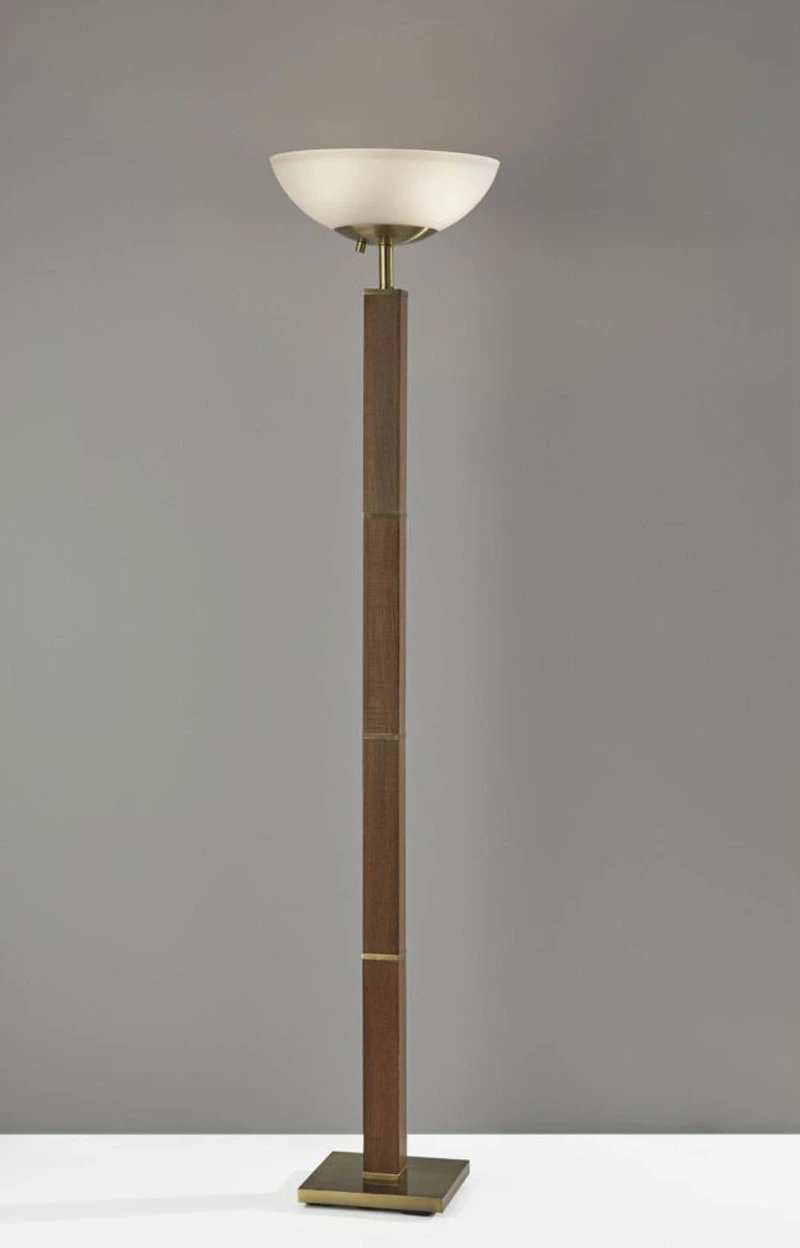 The Kona Torchiere features an MDF body with a wood PVC Veneer. Available with a Walnut finish, an Antique Brass accent, and a Cream Textured Fabric shade or a Black finish, a Black accent, and a Light Grey Textured Fabric shade. Includes a 73 inch Clear cord and a 10 inch square base. Shade: 16 inch diameter X 5.5 inch height. Controlled by a High/Low switch. UL listed.