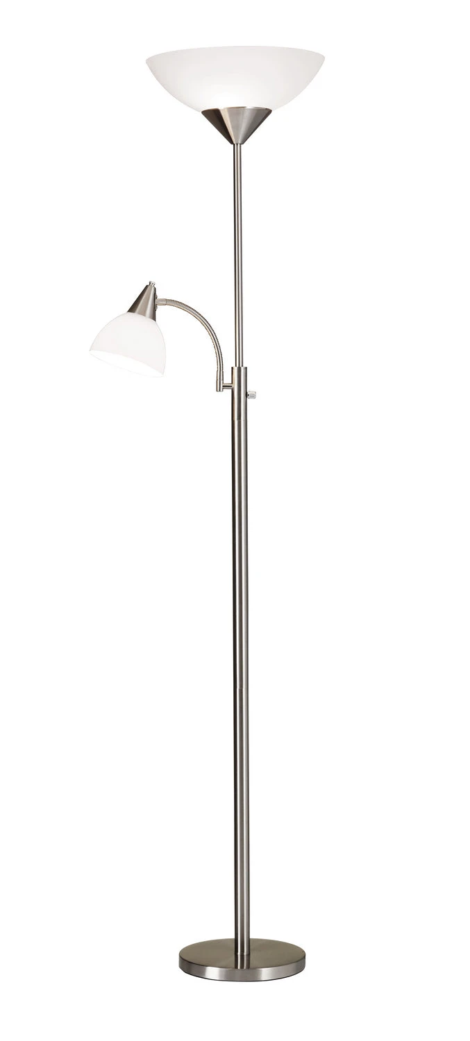 The Piedmont Combo Floor Lamp is a flexible and stylish lighting solution. It takes two 150 Watt or dimmable LED bulbs at the top for ambient lighting, but doesn’t stop there. The adjustable gooseneck reading light will accept a 60 Watt incandescent or equivalent for task lighting. The black pole body and gooseneck are topped with white acrylic shades. An Adesso patented 300 Watt Double Socket construction allows for two crisscrossed sockets, each holding on/off 150 Watt incandescent or LED bulbs which provides approximately 3 times more light than a typical torchiere. A simple 4-Way rotary switch is located on the pole, adjusting the light as follows: Uplight on, reading light on, both lights on, off. This lamp has a black cord and is smart outlet compatible. Bulbs are not included.