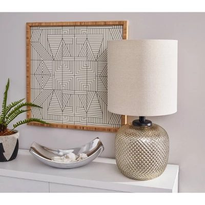 - Modern Design: A unique textured mercury glass is paired with a dark bronze finish and a high quality beige fabric shade